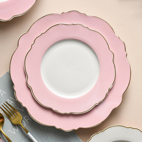 Assiette de présentation à bord doré de luxe Assiettes à dîner en porcelaine rose Service d'assiettes en céramique Vaisselle