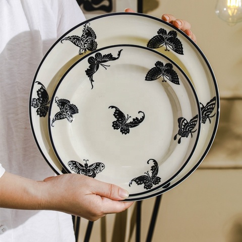 Vente en gros Assiette à dîner et bol en céramique 10 pouces imprimé papillon Vaisselle en porcelaine vintage