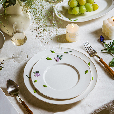 Assiette en céramique blanche vintage, ensemble d'assiettes à dîner en relief, assiettes à salade en porcelaine, plats de service pour la cuisine