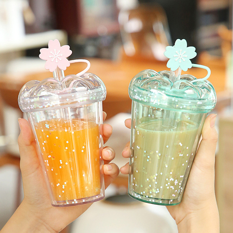 Dubbele Muur Plastic Sippy Cup Schattige Glitter Tumbler Cup Met Bloem Stro Topper