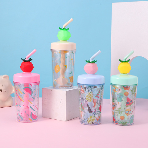 Cartoon Fruit Plastic Stro Cup Dubbele Wand Geïsoleerde Kinderen Tuimelaar Mengbeker Met Deksel